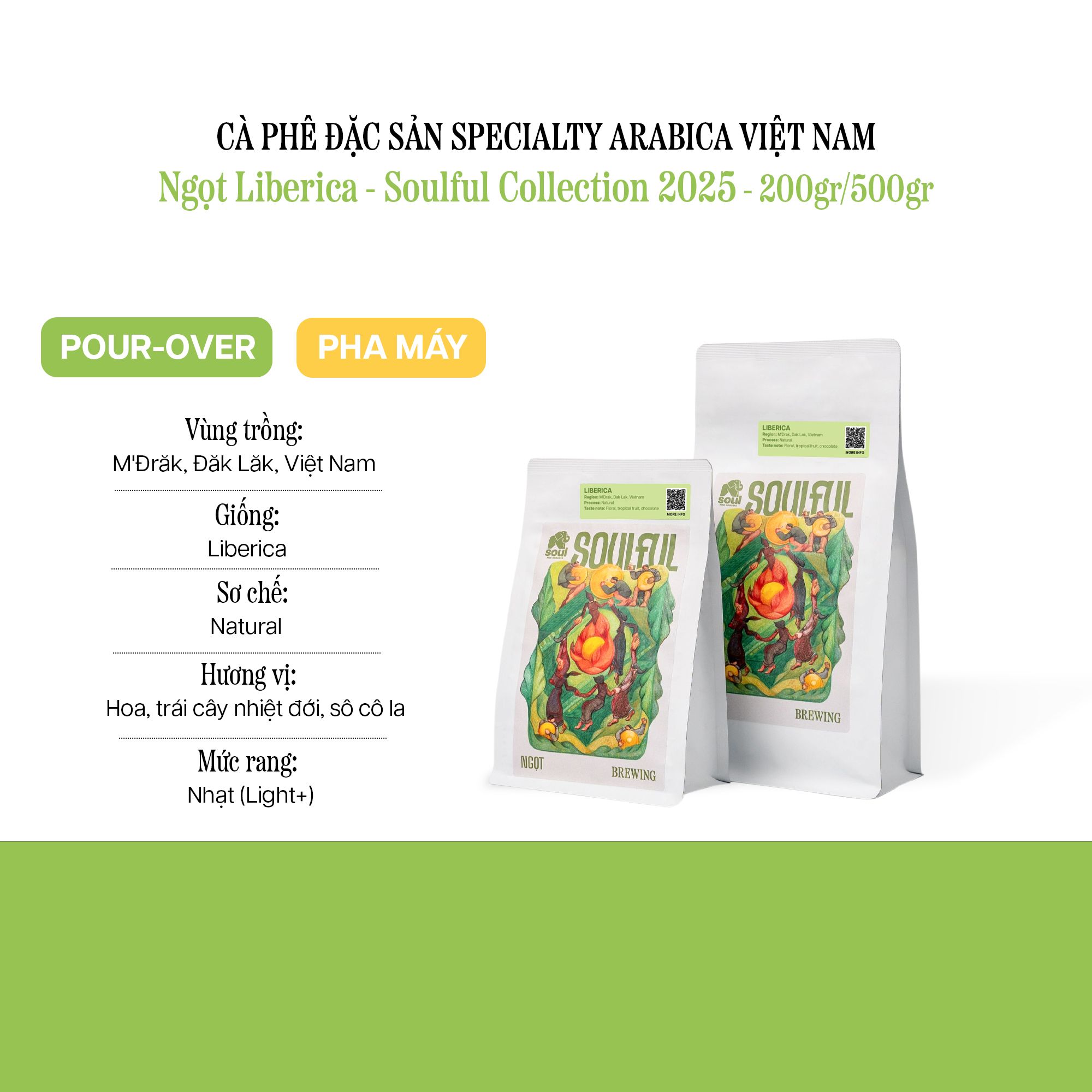 Về sản phẩm (Description) | Coffea Excelsa – còn được biết đến với tên gọi Coffea Liberica. Cà phê Cherry (tên gọi khác của Liberica) sở hữu khả năng thích nghi đa khí hậu và sức chống chịu sâu bệnh vượt trội. Tuy chỉ chiếm khoảng 1% sản lượng cà phê tiêu thụ toàn cầu, nhưng chính sự hiếm hoi ấy lại khiến Cherry trở thành một trong những trải nghiệm độc đáo và đáng khám phá nhất của cà phê Việt Nam. Soul sử dụng phương pháp chế biến khô (natural) , phơi nguyên trái, để quá trình lên men diễn ra tự nhiên ngay trong lớp vỏ và thịt quả. Những quả cà phê chín được phơi trực tiếp dưới nắng, trải dài trên giàn trong điều kiện thông thoáng. Quá trình này được kiểm soát cẩn thận và kéo dài từ 3 đến 5 tuần, nhằm đảm bảo hạt cà phê đạt độ ẩm lý tưởng, đồng thời các hợp chất hương vị có thời gian thẩm thấu sâu vào bên trong hạt. Hương vị đặc trưng của giống Liberica là độ ngọt sâu, dày dặn và hương thơm tròn đầy, phong phú – tạo nên một trải nghiệm đậm đà, khác biệt và khó quên. ---------------------------------------- Coffea Excelsa, also known as Coffea Liberica or locally referred to as Cherry coffee, is renowned for its adaptability to diverse climates and exceptional resistance to pests and diseases. Despite accounting for just around 1% of global coffee consumption, its rarity has made Liberica one of the most distinctive and intriguing coffee experiences to explore in Vietnam.
